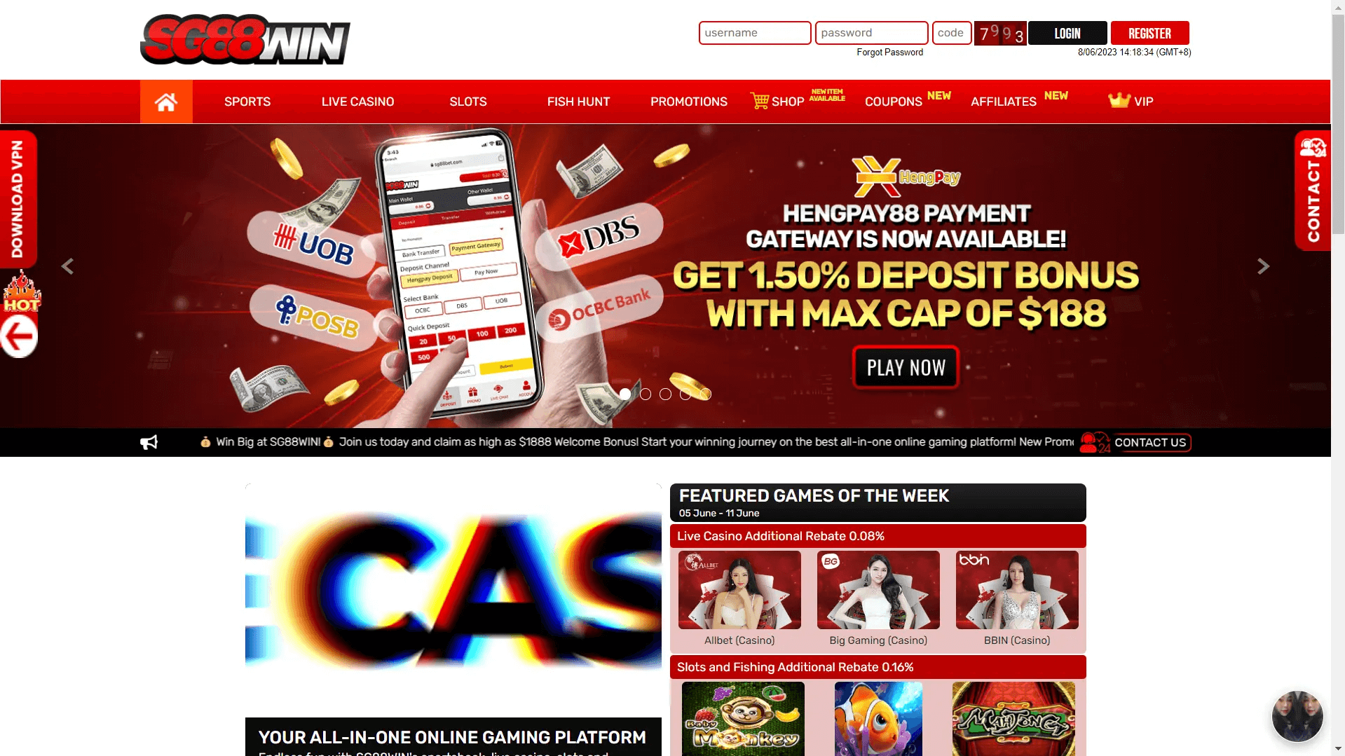 SG88Win - Free $28 + 120% First Deposit Up to $1,888